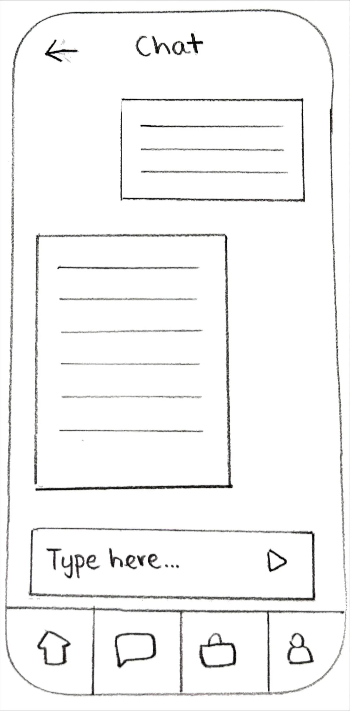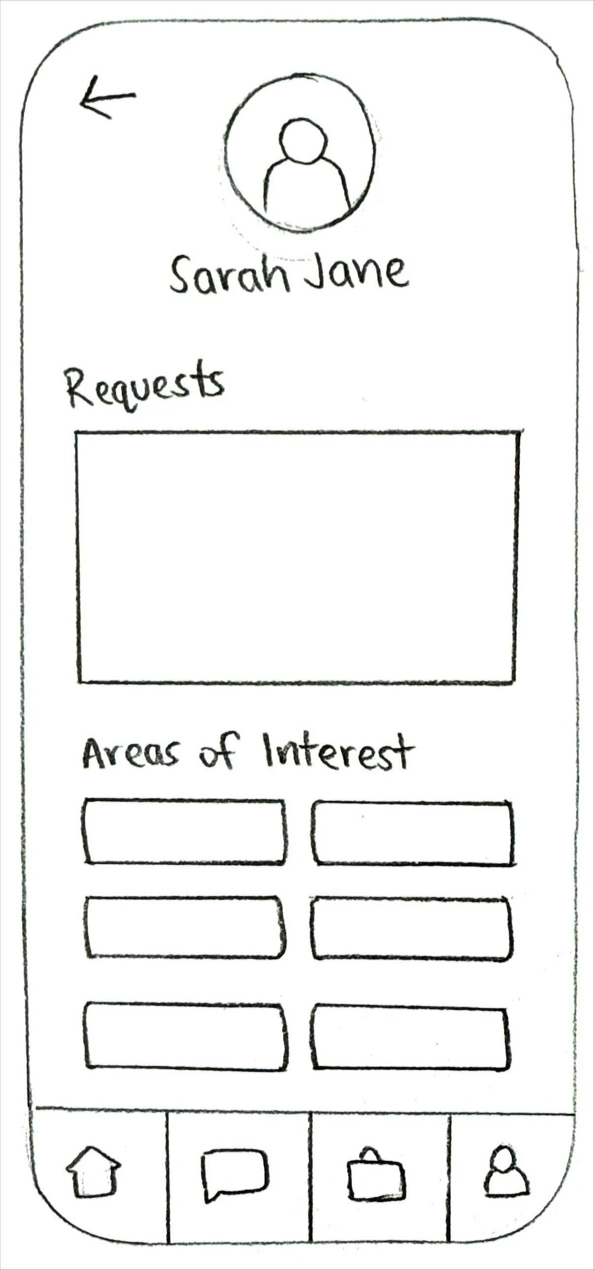 The following low-fidelity wireframes capture two core components designed for Law Seek-O’s mobile app: a conversational chatbot interface that supports users through complex legal queries and a user profile that help individuals navigate their active requests and access legal content tailored to their needs. These initial designs for the home, chat, and profile screens focus on establishing the foundational layout, navigation flow, and key interactions before progressing to high-fidelity prototypes.